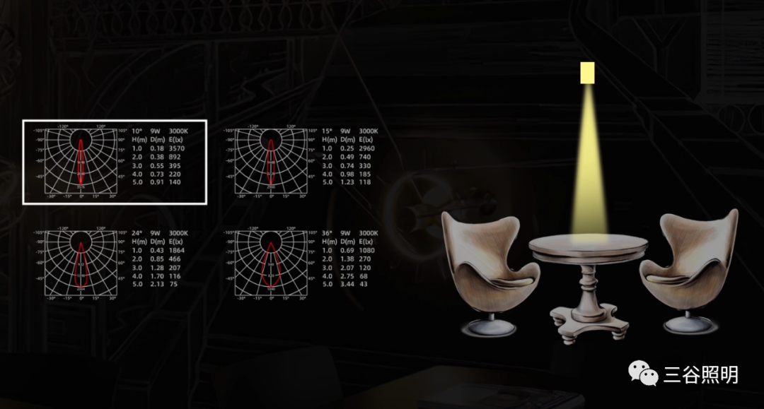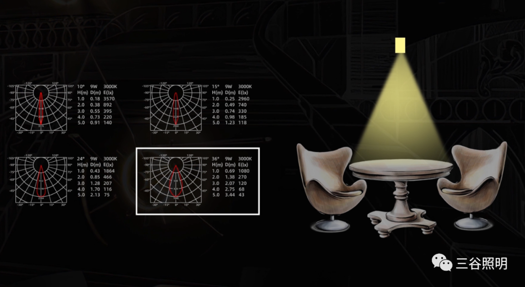 或者装饰品之类的制造一点华丽的光,就可以选用窄光束角